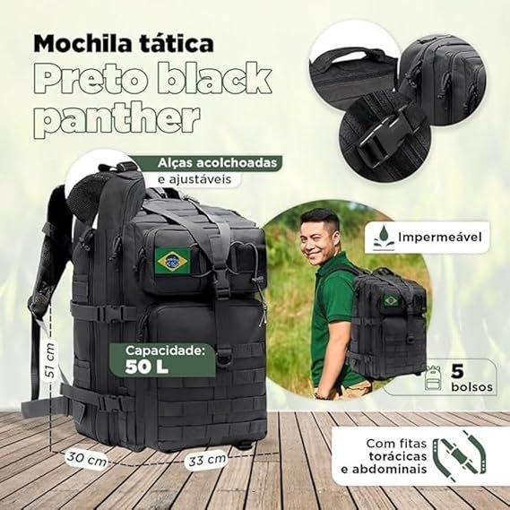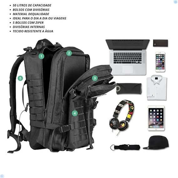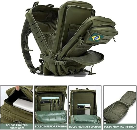 Design Tático: Visual robusto com múltiplos compartimentos, bolsos estratégicos e sistema MOLLE para acoplar acessórios;